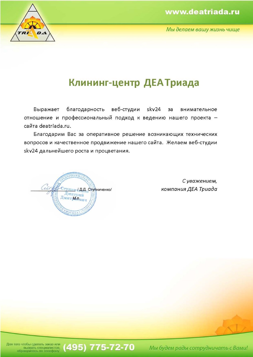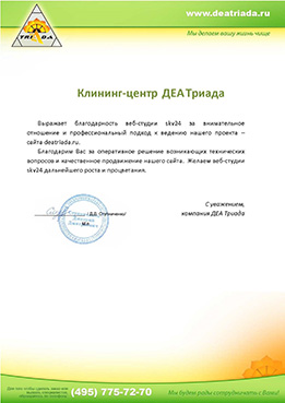 Клининг-центр ДЕА Триада выражает благодарность веб-студии skv24 за внимательное отношение и профессиональный подход к ведению нашего проекта – сайта deatriada.ru