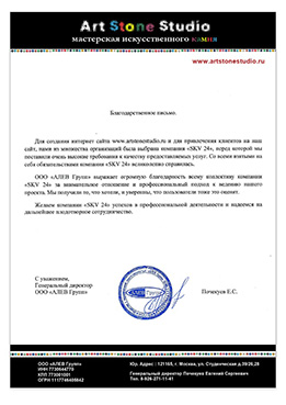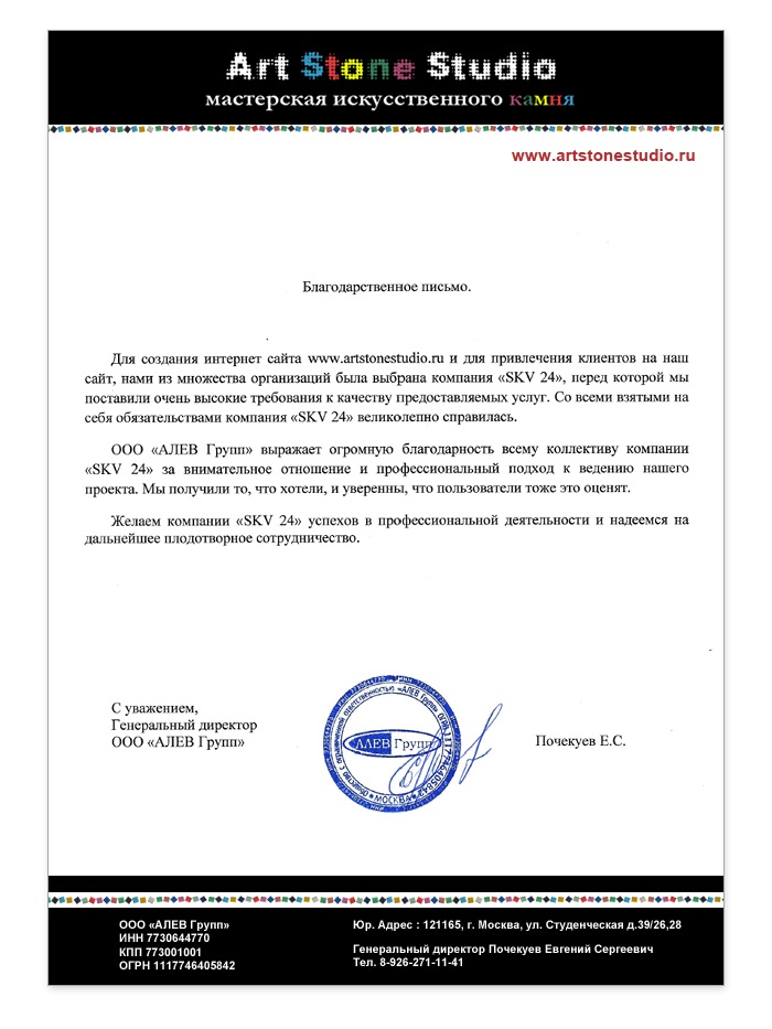 Для создания интернет сайта www.artstonestudio.ru и для привлечения клиентов на наш сайт, нами из множества организаций была выбрана компания «SKV24», перед которой мы поставили очень высокие требования к качеству предоставляемых услуг. Со всеми взятыми на себя обязательствами компания «SKV24» великолепно справилась.