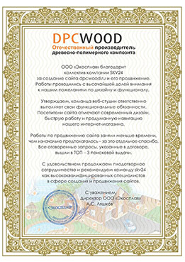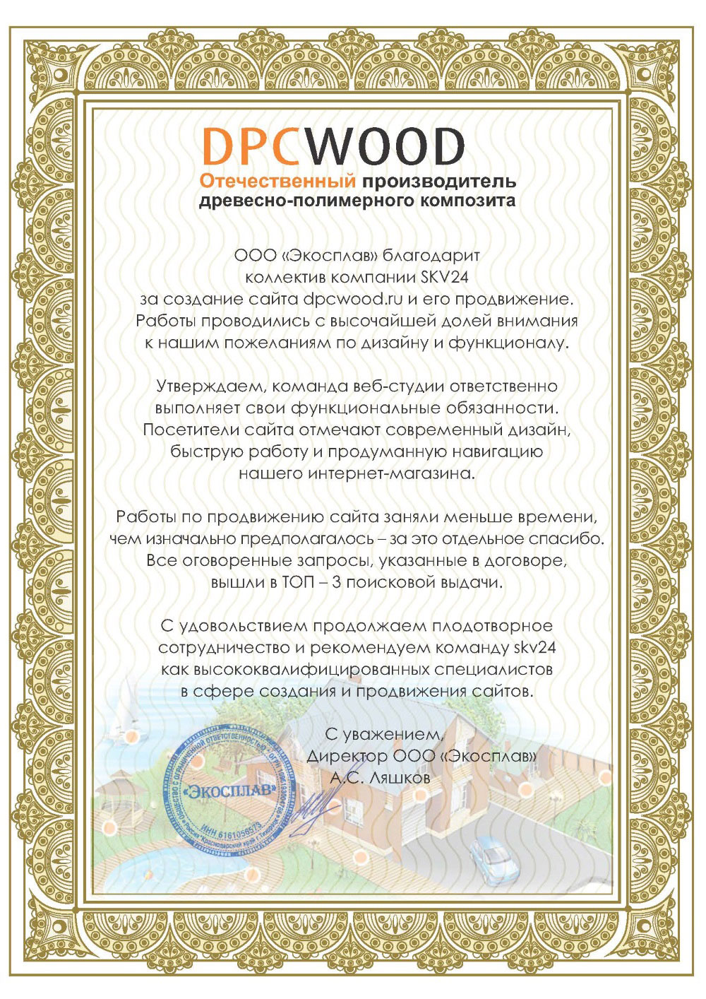 ООО«Экосплав» благодарит коллектив компании SKV24 за создание сайта dpcwood.ru и его продвижение. Работы проводились с высочайшей долей внимания к нашим пожеланиям по дизайну и функционалу.